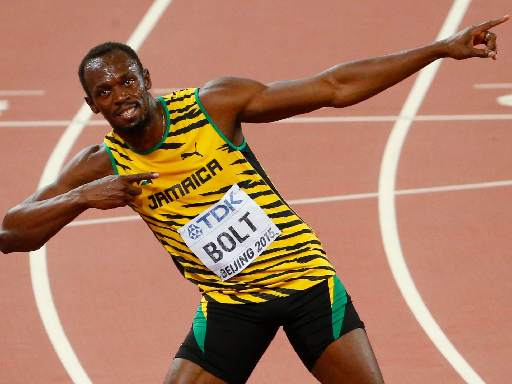 Usain Bolt 100m Victory pose in Beijing go into his famous Lighting Bolt pose.